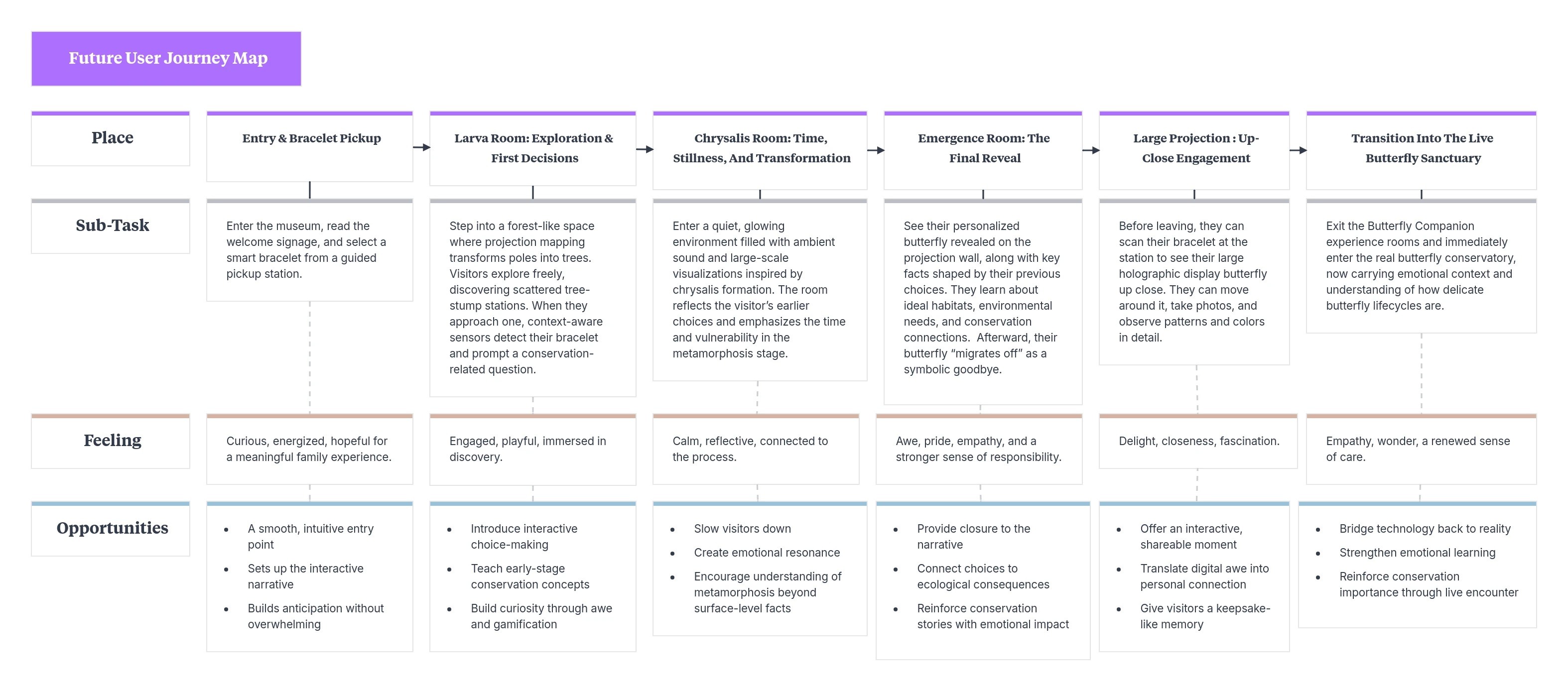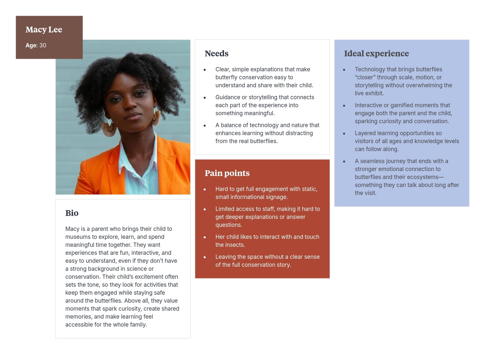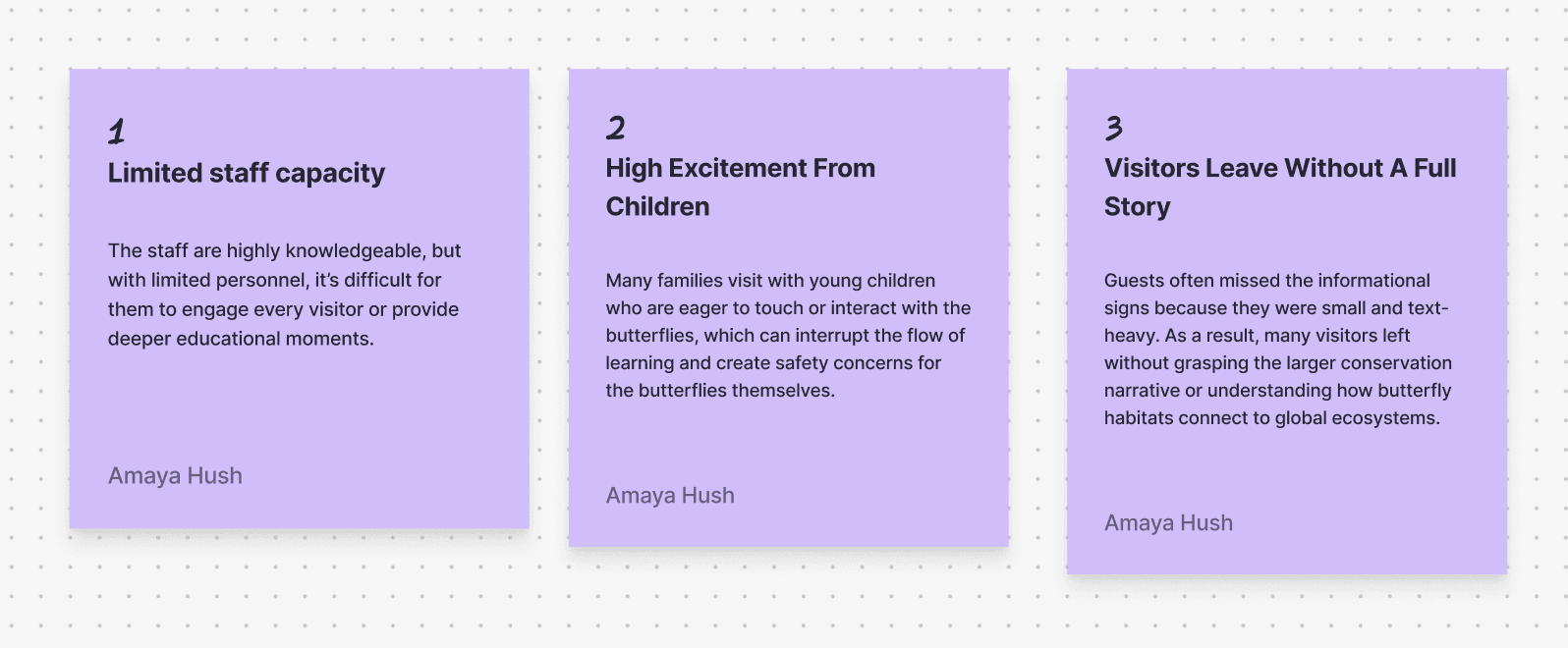 Our challenge centered on how to encourage deeper engagement with butterfly conservation stories while preserving the magic of the live sanctuary. We needed to understand how technology could enhance learning and immersion without overshadowing the real butterflies or disrupting the sense of awe that comes from encountering them up close.