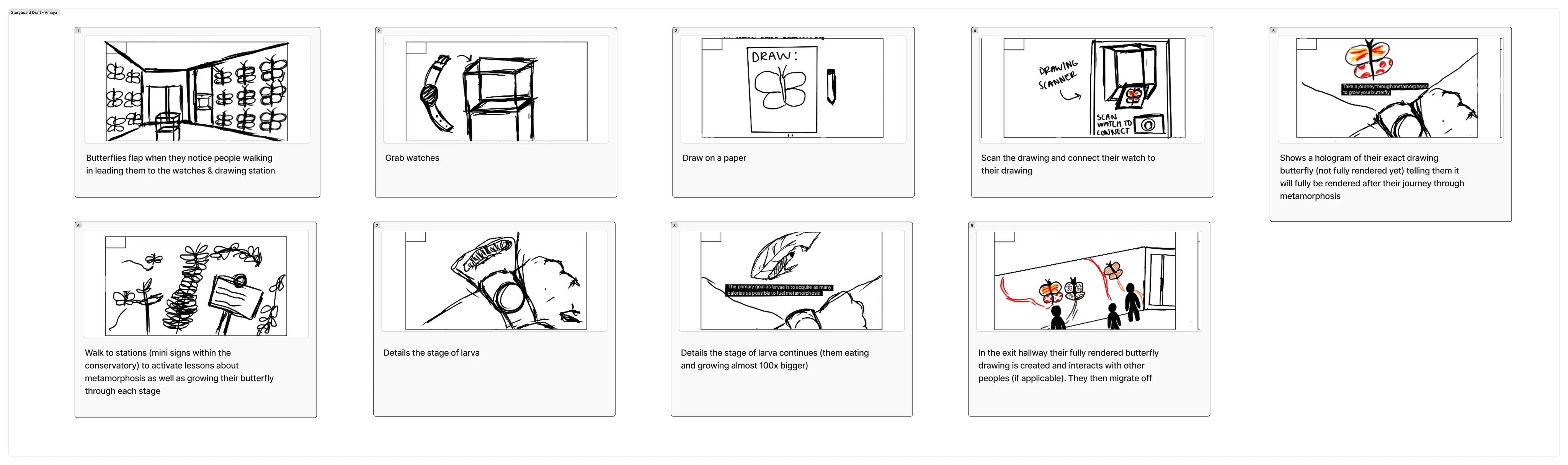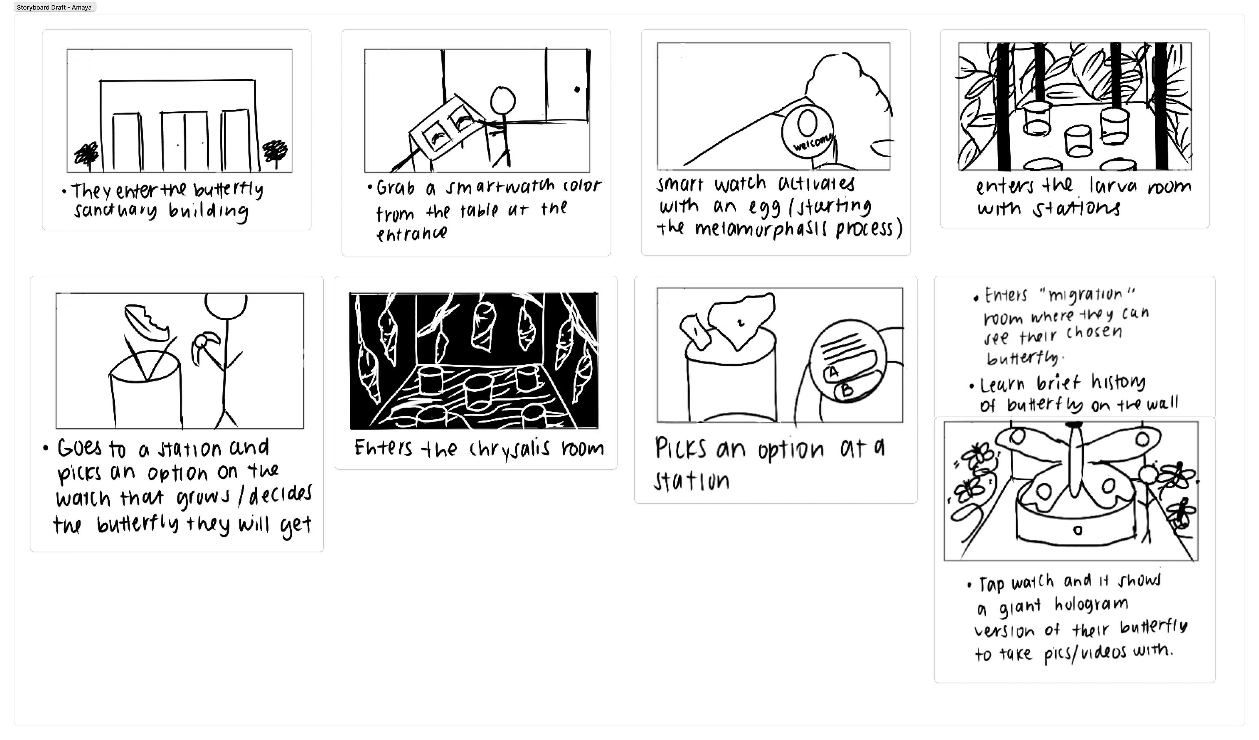 At the start of the project, my partner and I let our ideas run big. We each created an early storyboard to explore different ways technology could bring butterfly conservation to life. One concept focused on drawing a butterfly digitally and using a holographic display to show its evolving state. Visitors would move through the live conservatory and stop at mini stations where environmental choices shaped their companion.