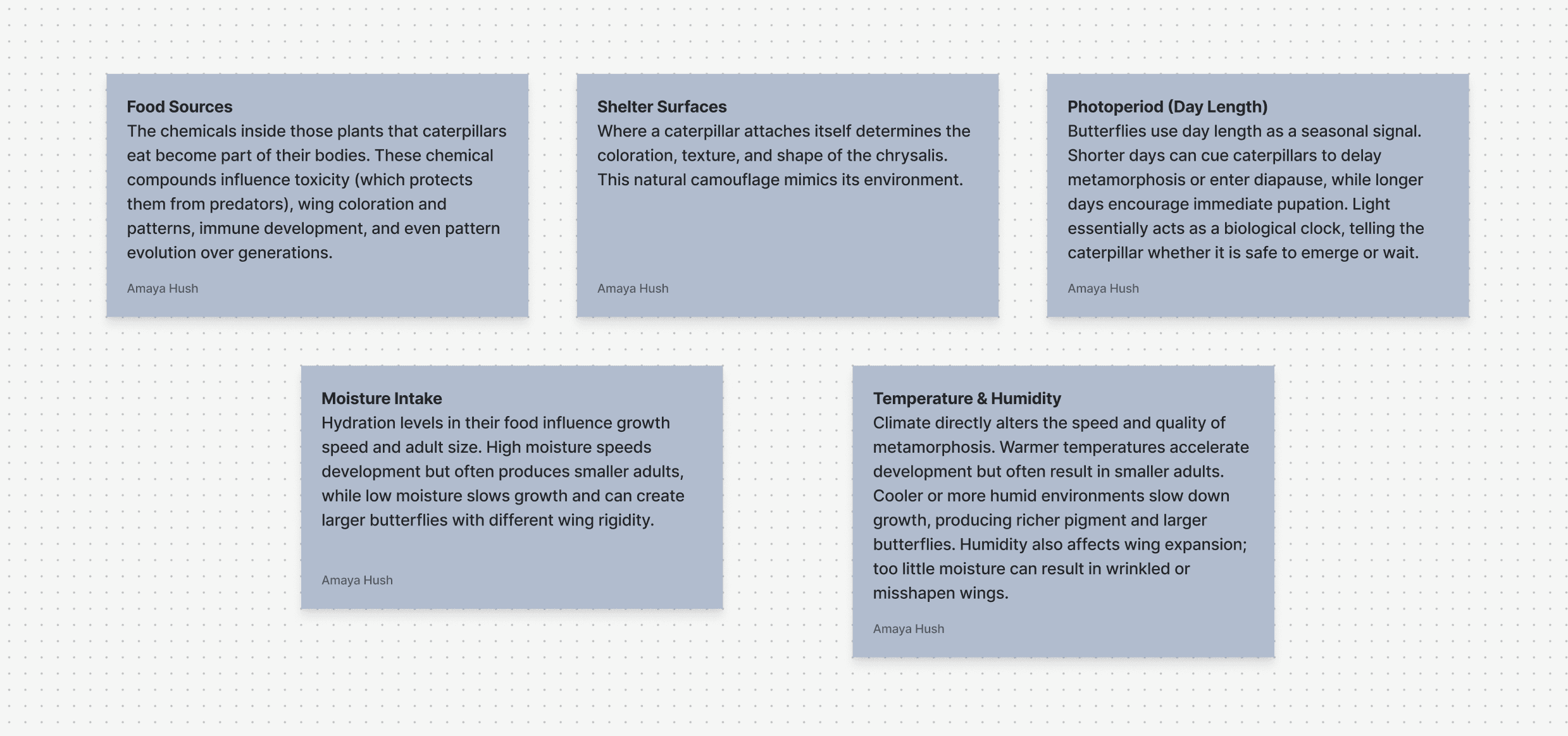 As we explored the conservation story behind butterflies, we wanted to understand the real scientific factors that influence how they grow, survive, and adapt. Our goal was to learn how environmental variables shape a butterfly’s journey, from caterpillar to chrysalis to adult, and how these insights could guide a more meaningful visitor experience rooted in awe, empathy, and environmental responsibility.