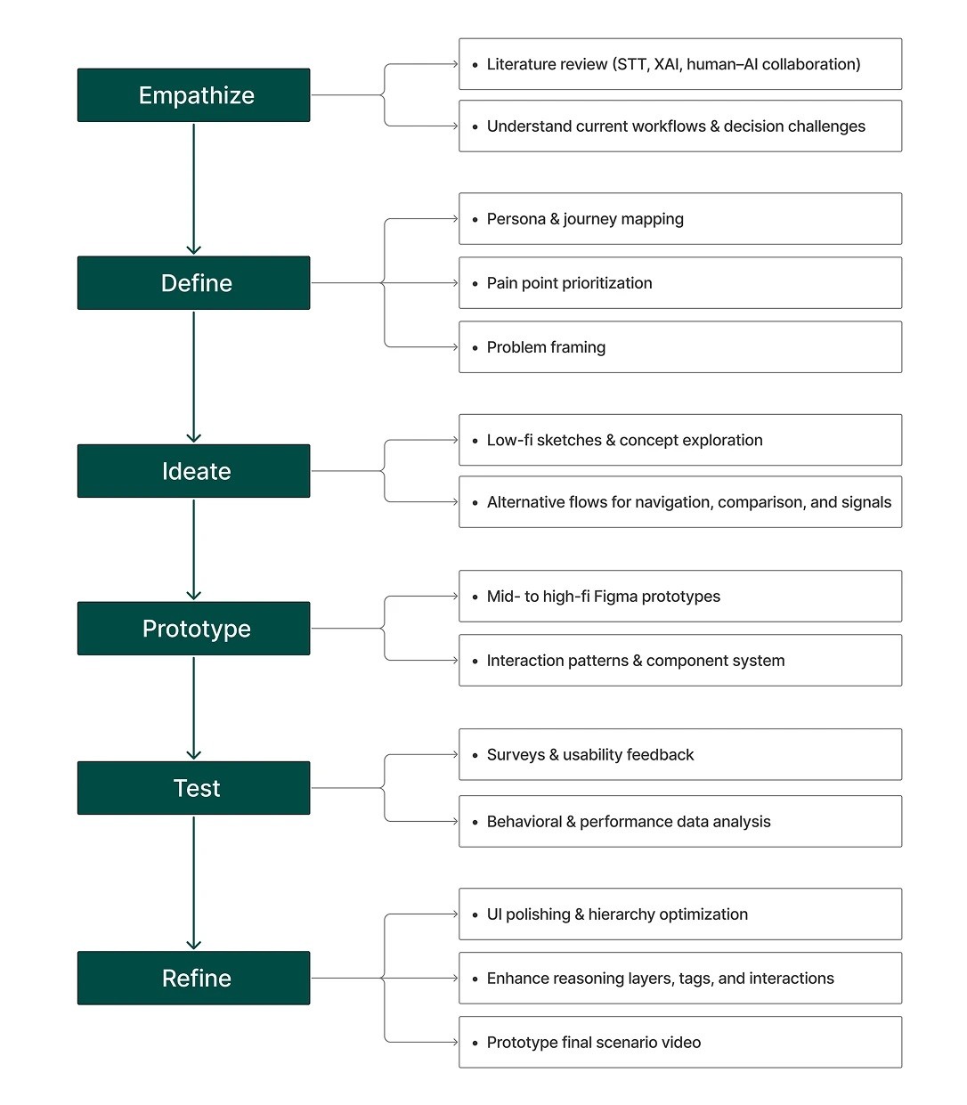 This project followed an iterative design thinking process that balanced human-centered research with the technical complexity of explainable AI systems. The process emphasized understanding analyst workflows, decision pressures, and trust-building behaviors before moving into solution design.