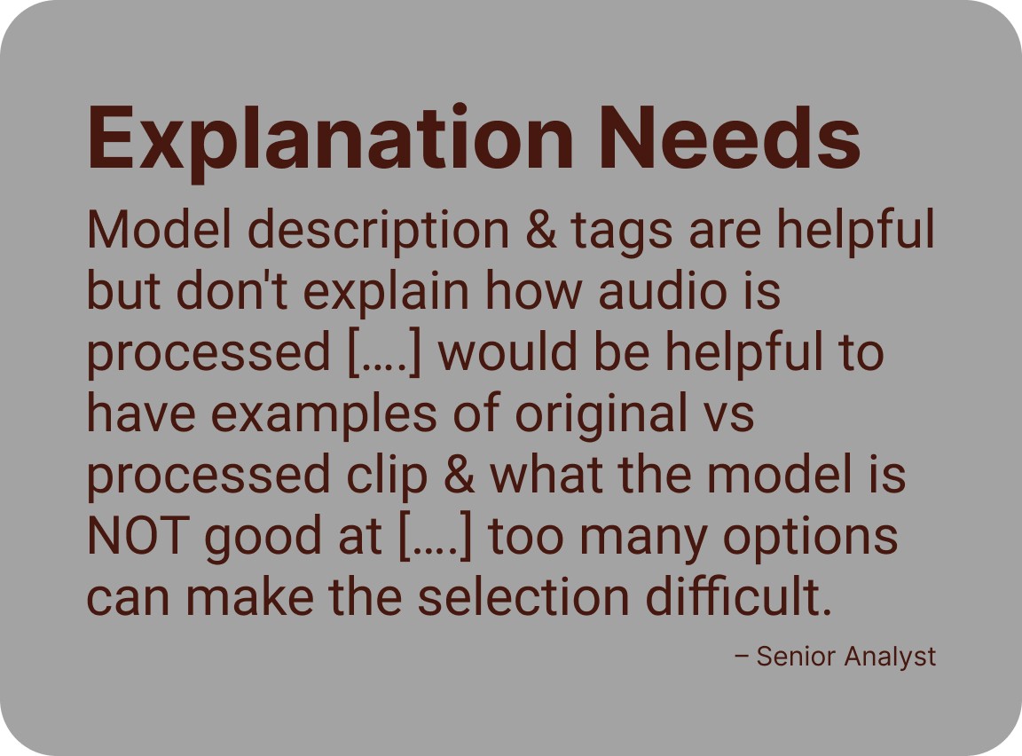 Insights from the research showed that many tools prioritize performance metrics and outputs, offering limited support for understanding why a model is recommended for a given audio scenario. Analysts currently have little agency using one default STT model and its takes a lot of time to pull insights from audio with limited tools. Research in explainable AI emphasized that trust is not built through accuracy alone, but through reasoning that users can access, question, and stand behind, especially in high-stakes analytical work.
