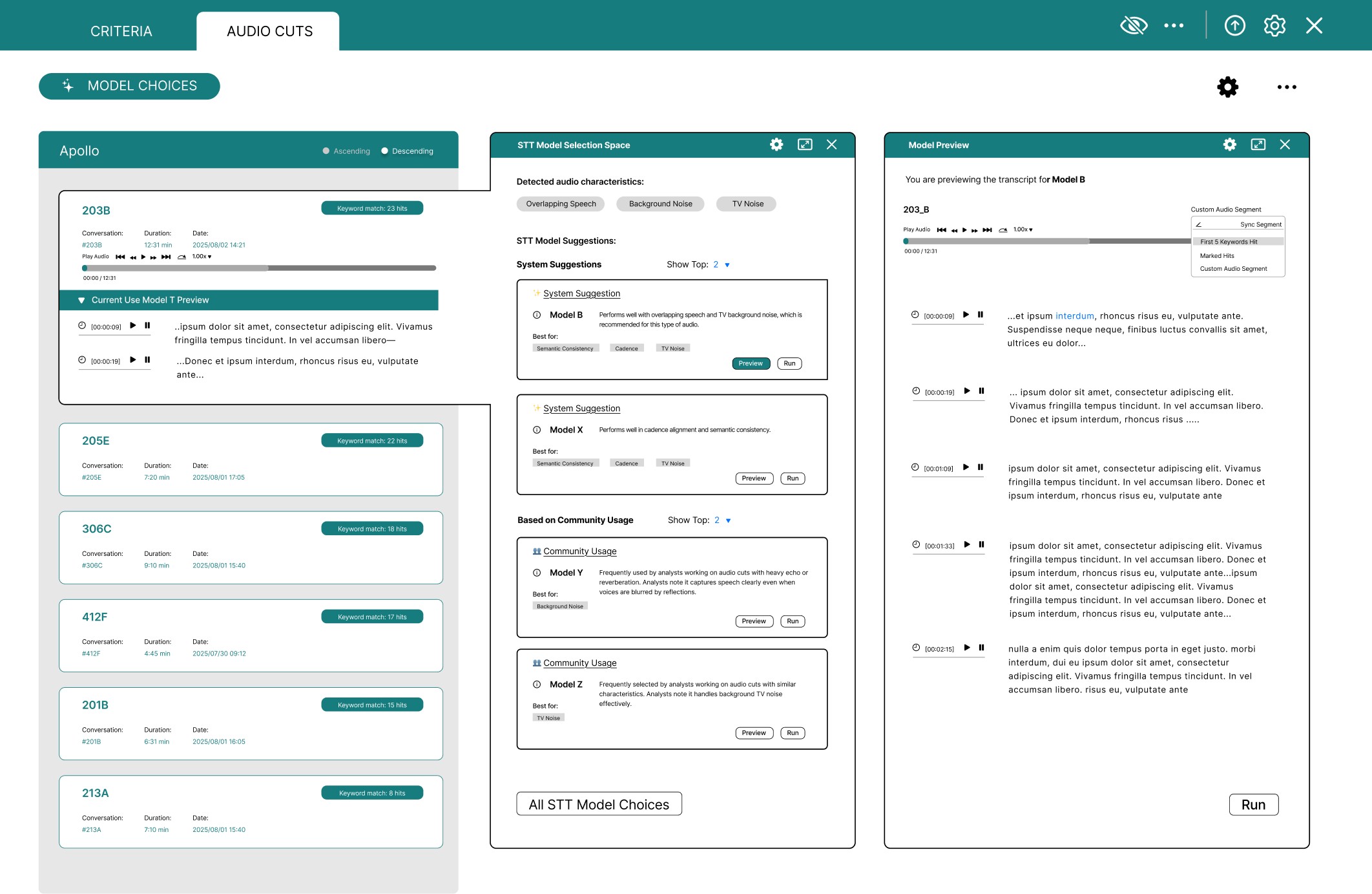 After conducting multiple sessions of ideation methodologies, we chose three low-fidelity concept directions to understand how multiple STT models and explanations could be introduced within an existing audio playback system. All concepts were intentionally designed on top of a provided screen from the current analyst workflow tool, allowing us to explore new interactions while staying grounded in a familiar interface. These early concepts helped us evaluate tradeoffs between clarity, depth, and cognitive load.