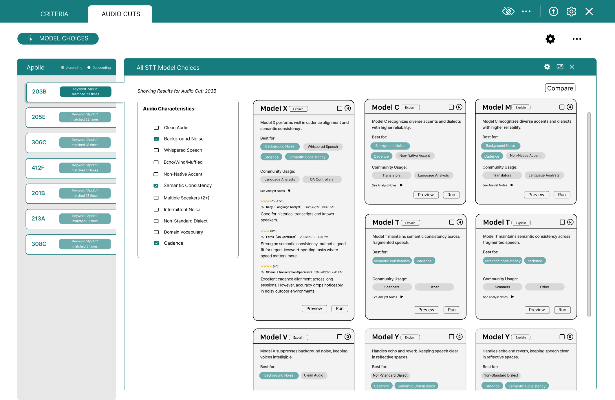 This direction emphasizes analyst agency by allowing users to explicitly select which audio characteristics best match their current audio selection. Based on these inputs, the system returns a tailored set of STT model recommendations presented as comparable model cards.