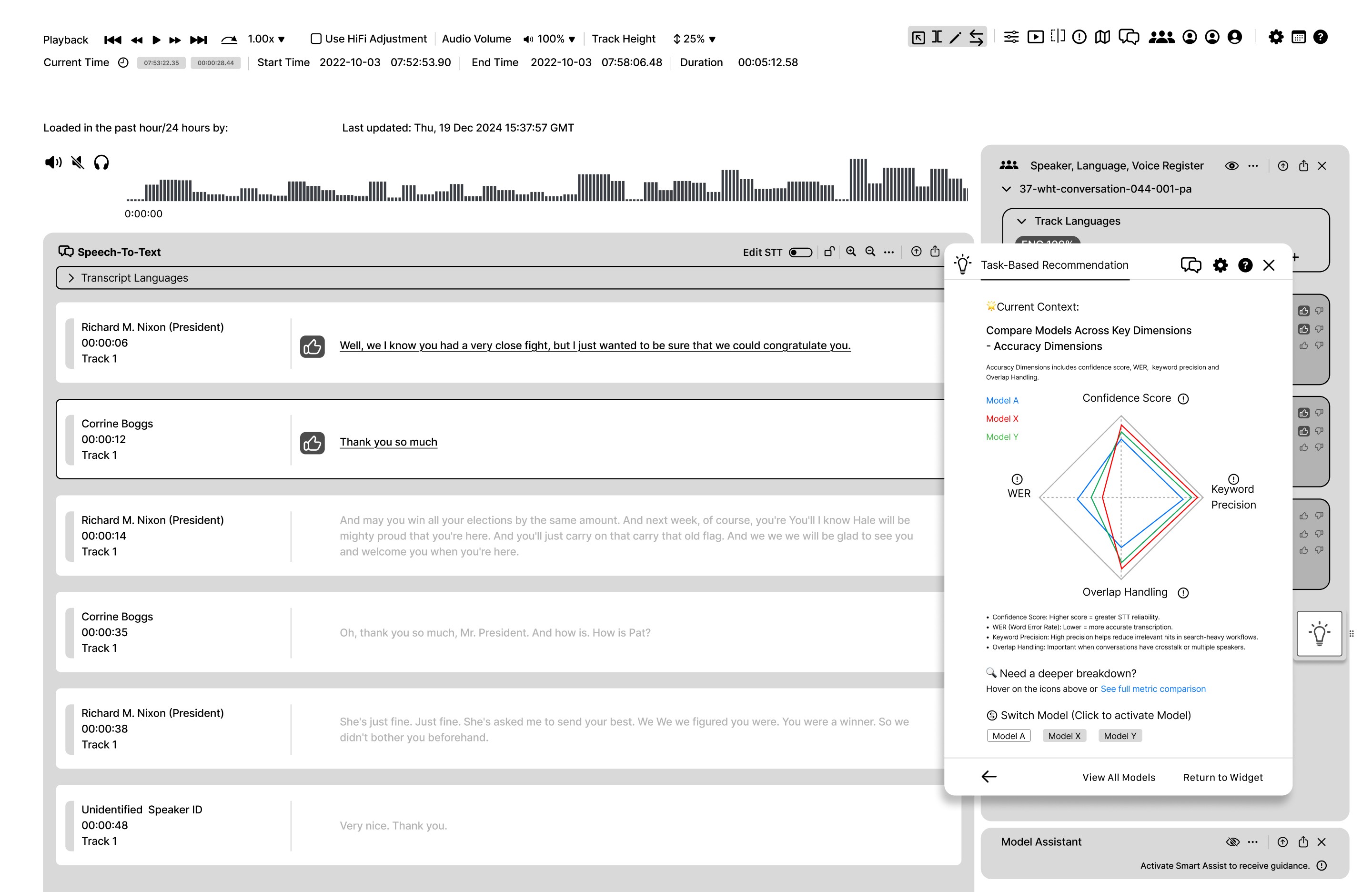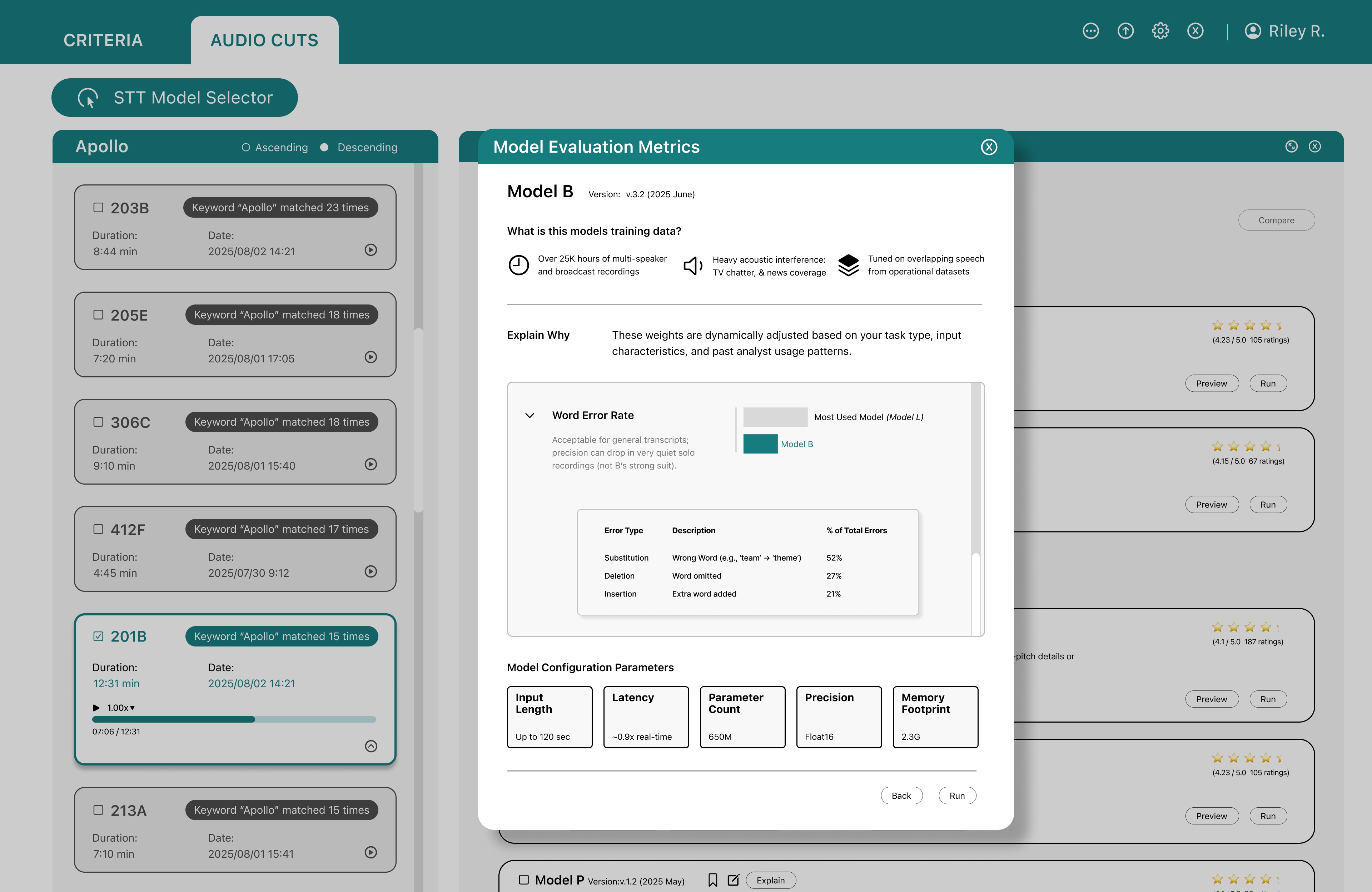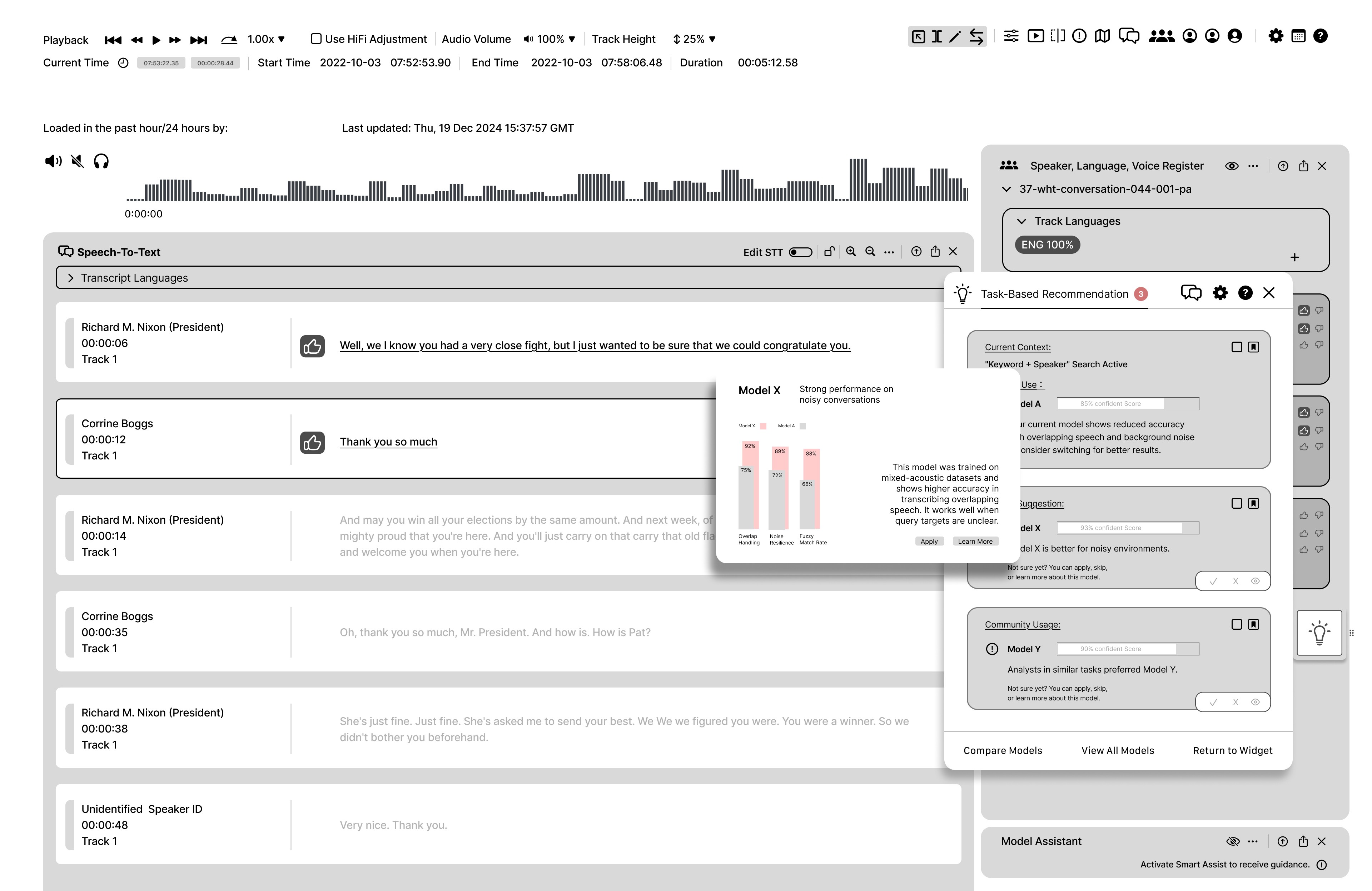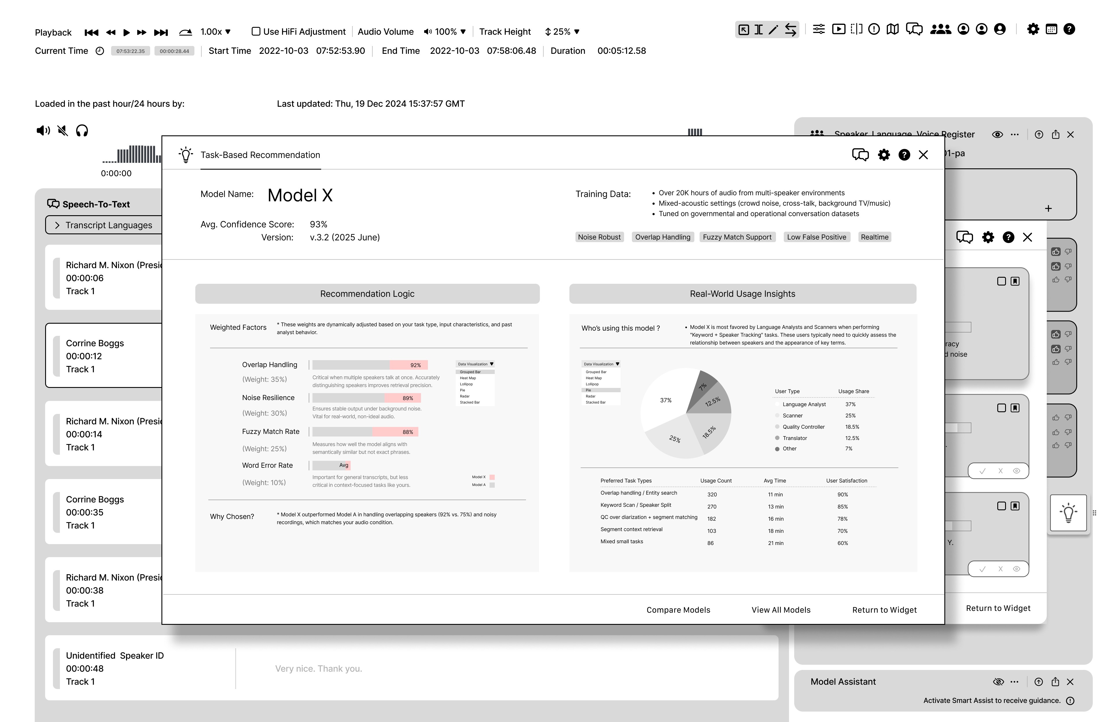 At the time of this project, analysts typically worked with a single speech-to-text (STT) model, limiting their ability to adapt model selection to different audio conditions. This project explored a speculative yet realistic future in which analysts have access to multiple STT models and must select the most suitable one for their specific audio files. Designing for this expanded decision space introduced new challenges around transparency, trust, and confidence.