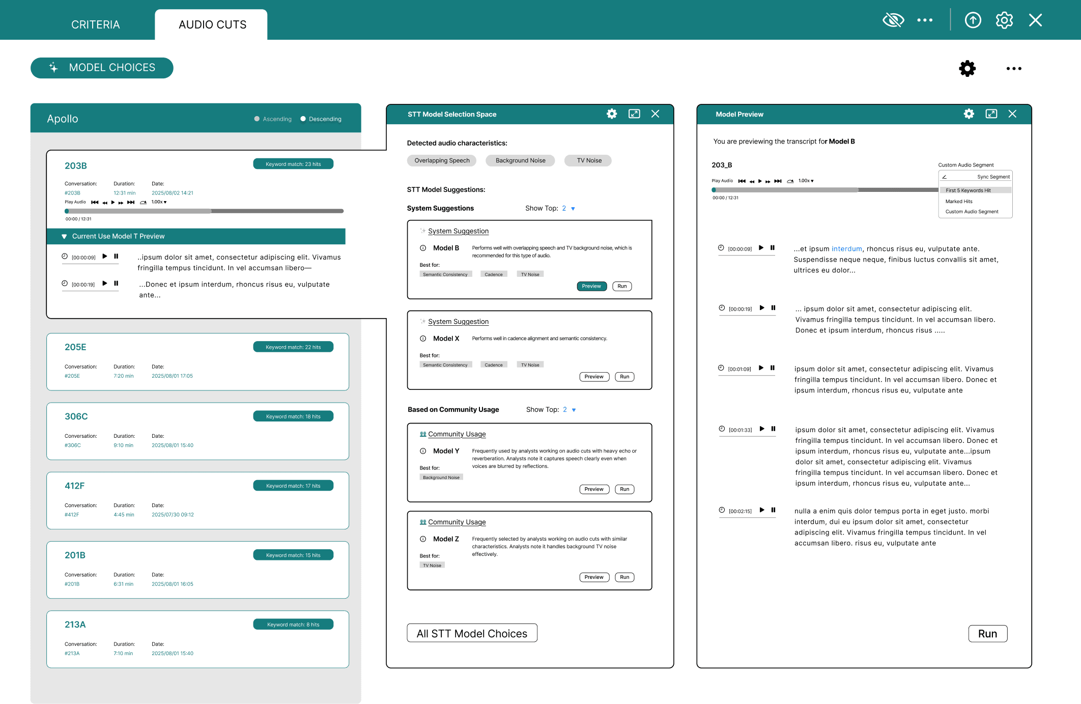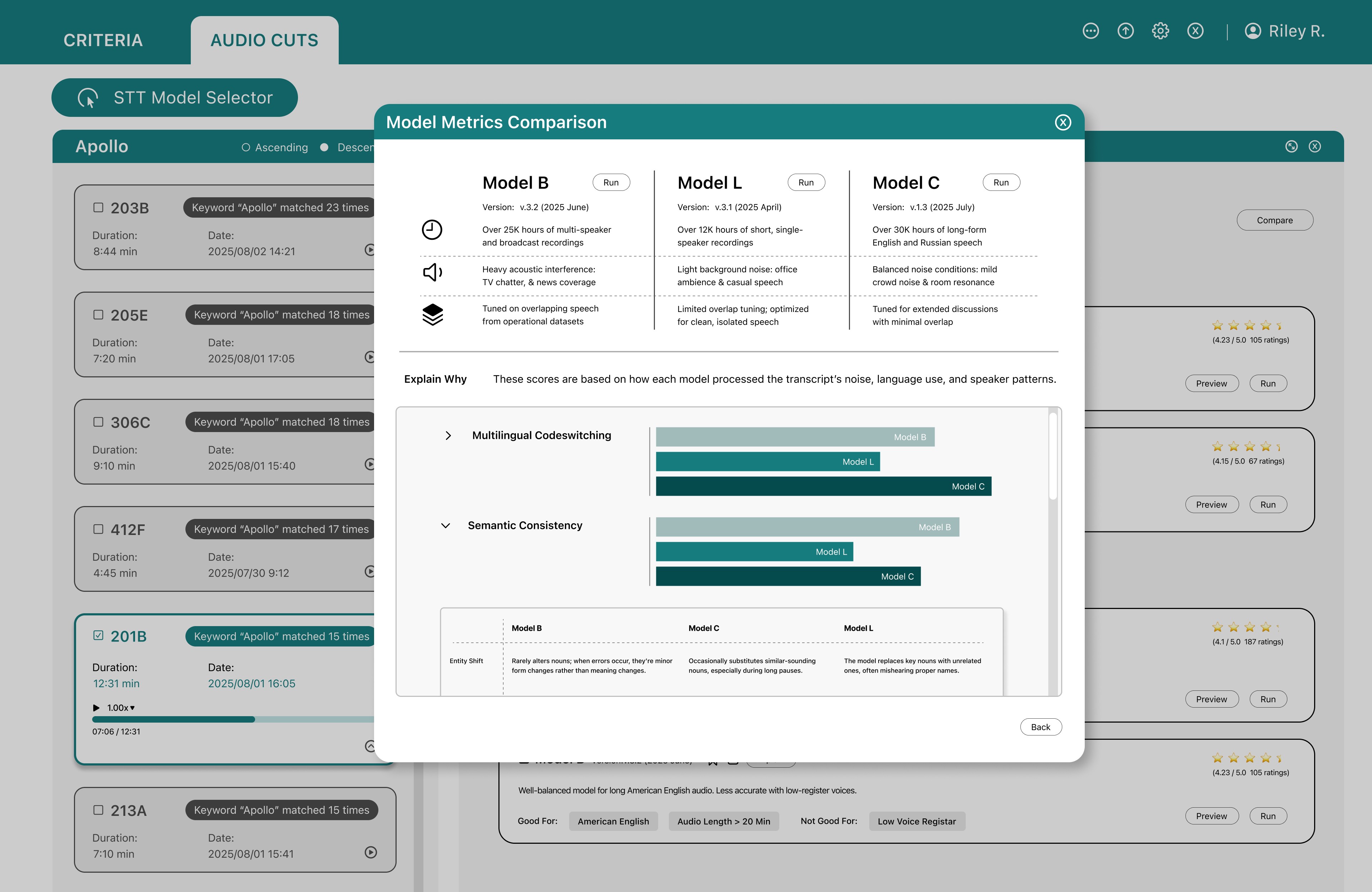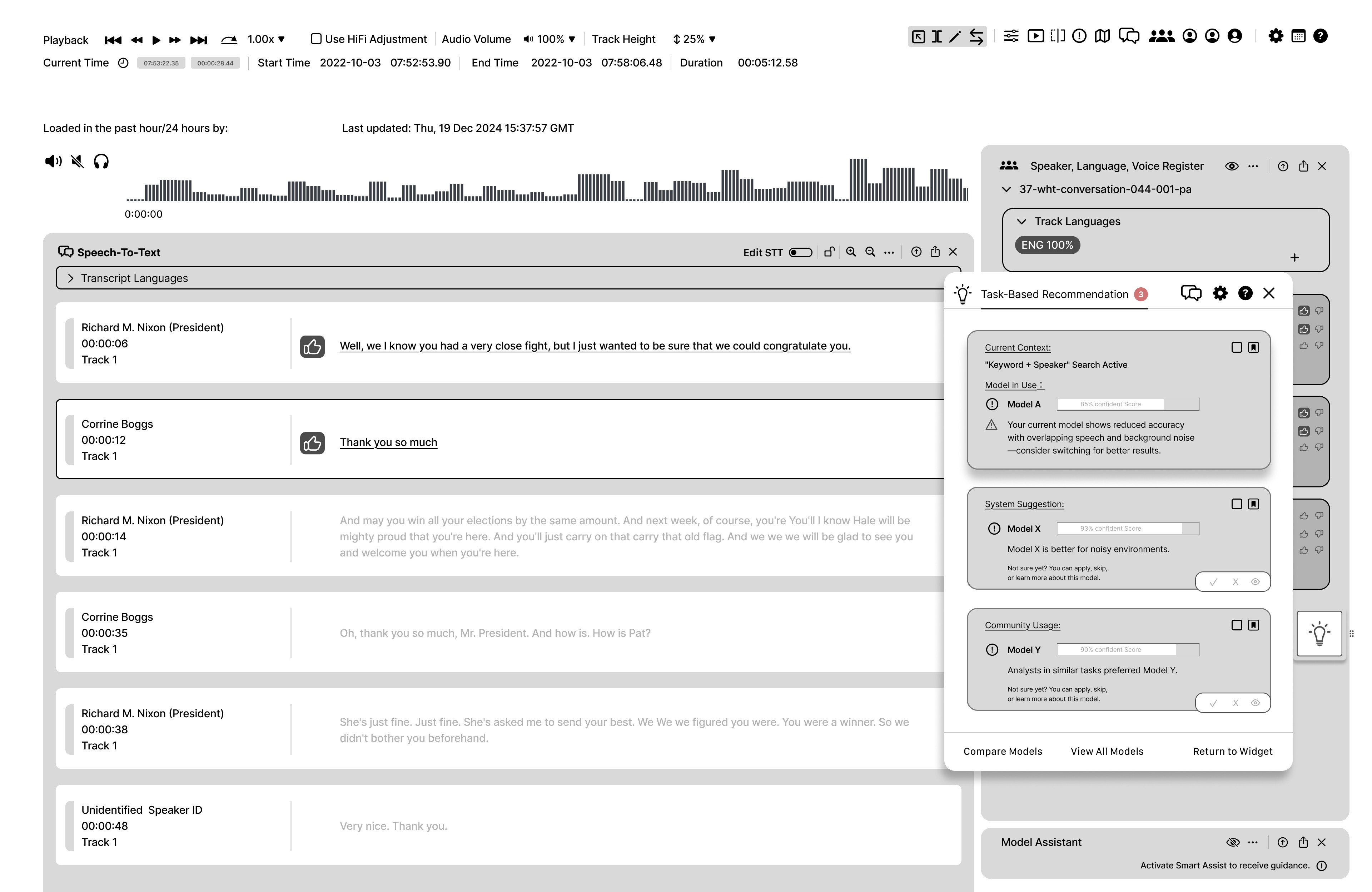 At the time of this project, analysts typically worked with a single speech-to-text (STT) model, limiting their ability to adapt model selection to different audio conditions. This project explored a speculative yet realistic future in which analysts have access to multiple STT models and must select the most suitable one for their specific audio files. Designing for this expanded decision space introduced new challenges around transparency, trust, and confidence.
