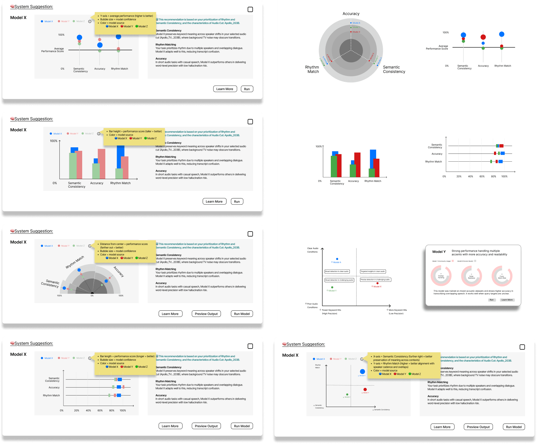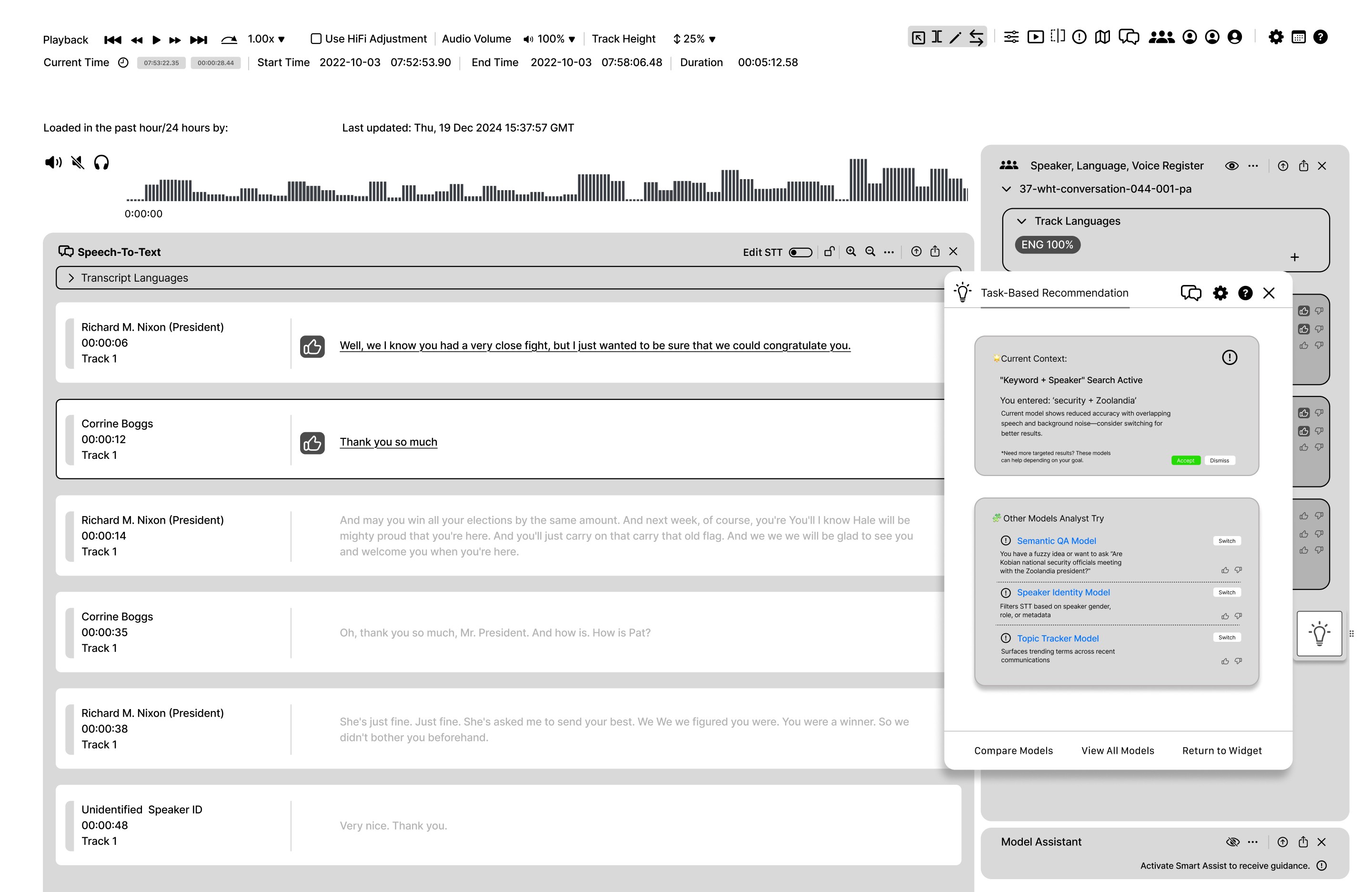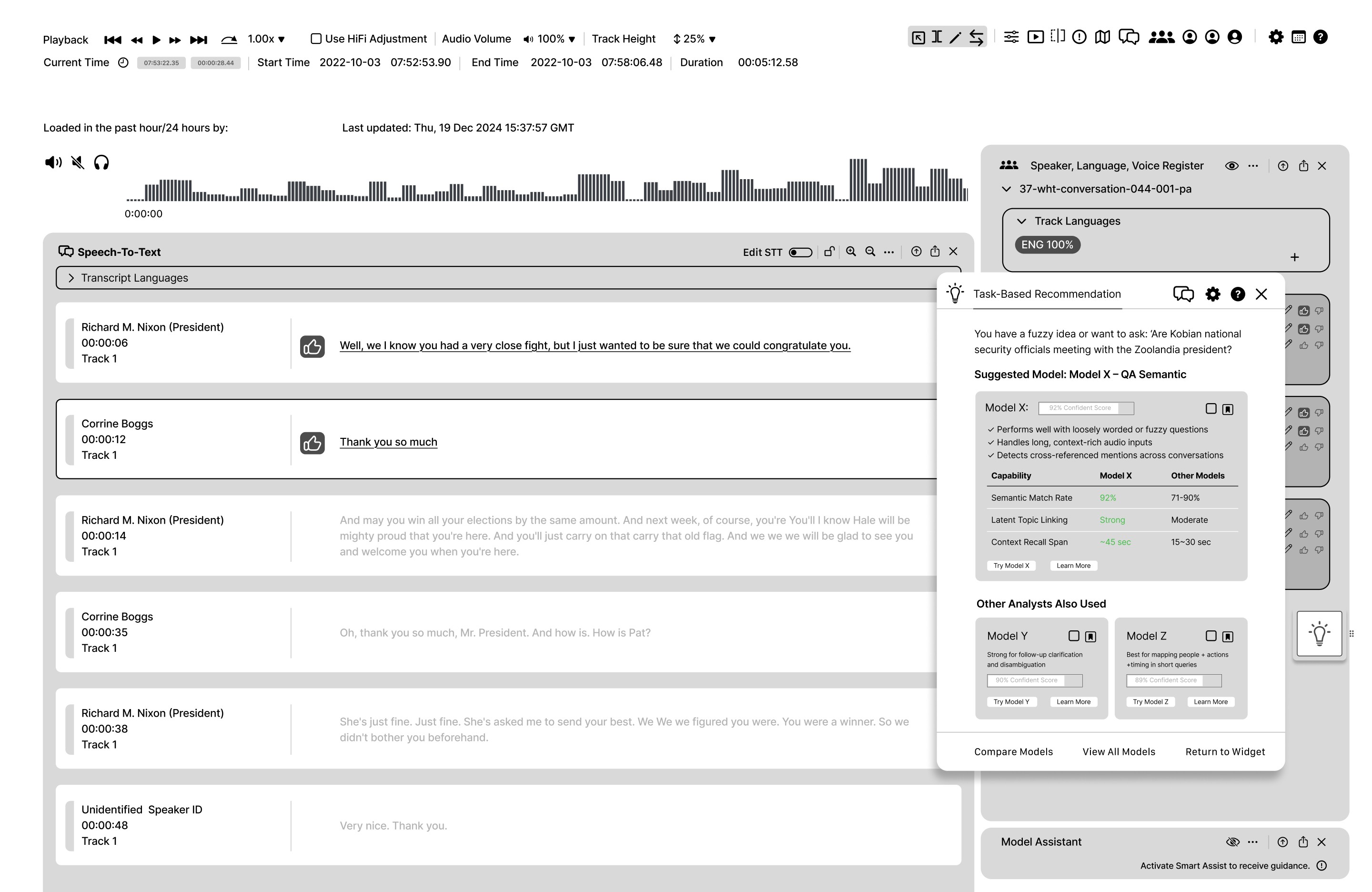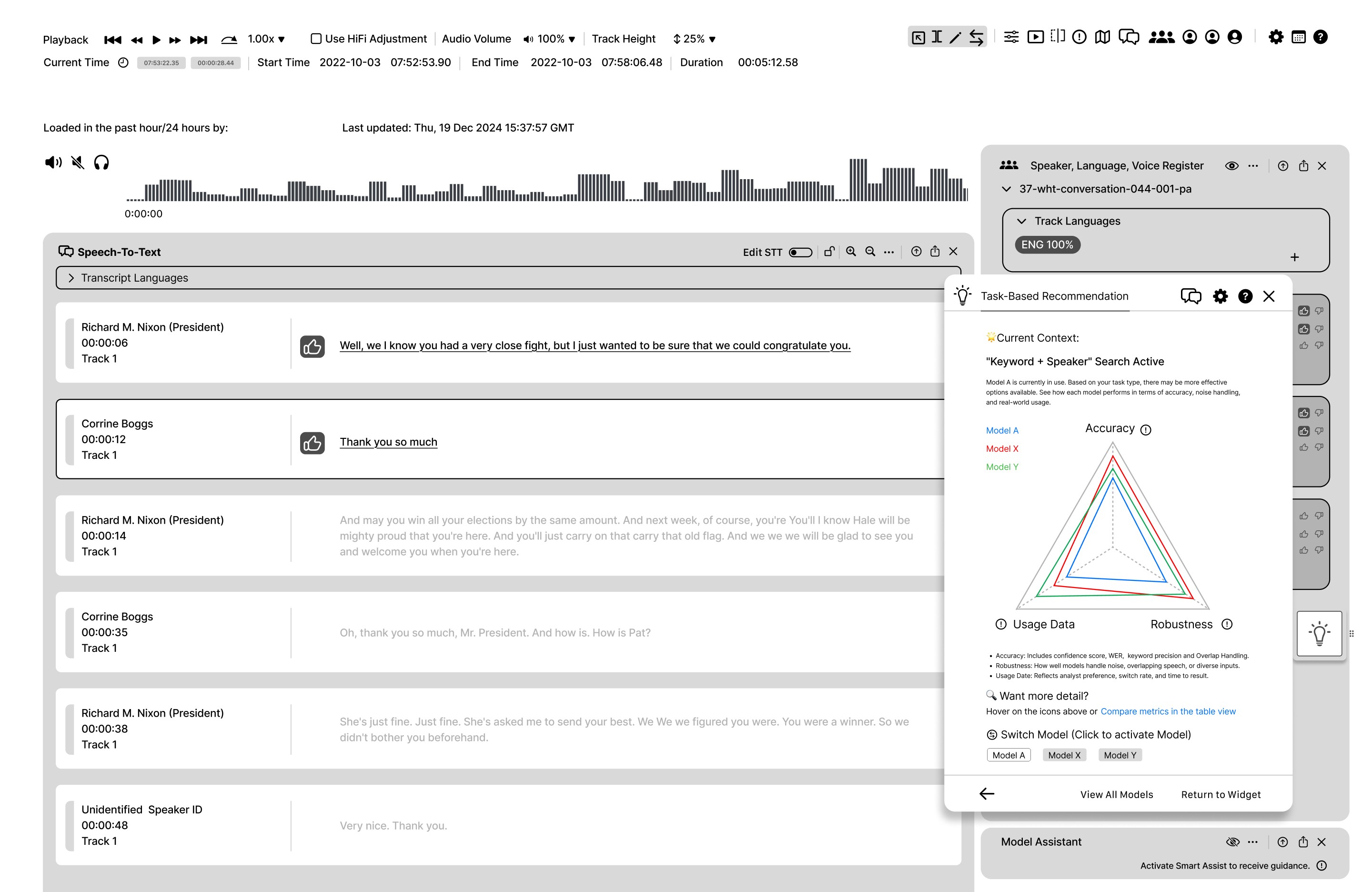 At the time of this project, analysts typically worked with a single speech-to-text (STT) model, limiting their ability to adapt model selection to different audio conditions. This project explored a speculative yet realistic future in which analysts have access to multiple STT models and must select the most suitable one for their specific audio files. Designing for this expanded decision space introduced new challenges around transparency, trust, and confidence.