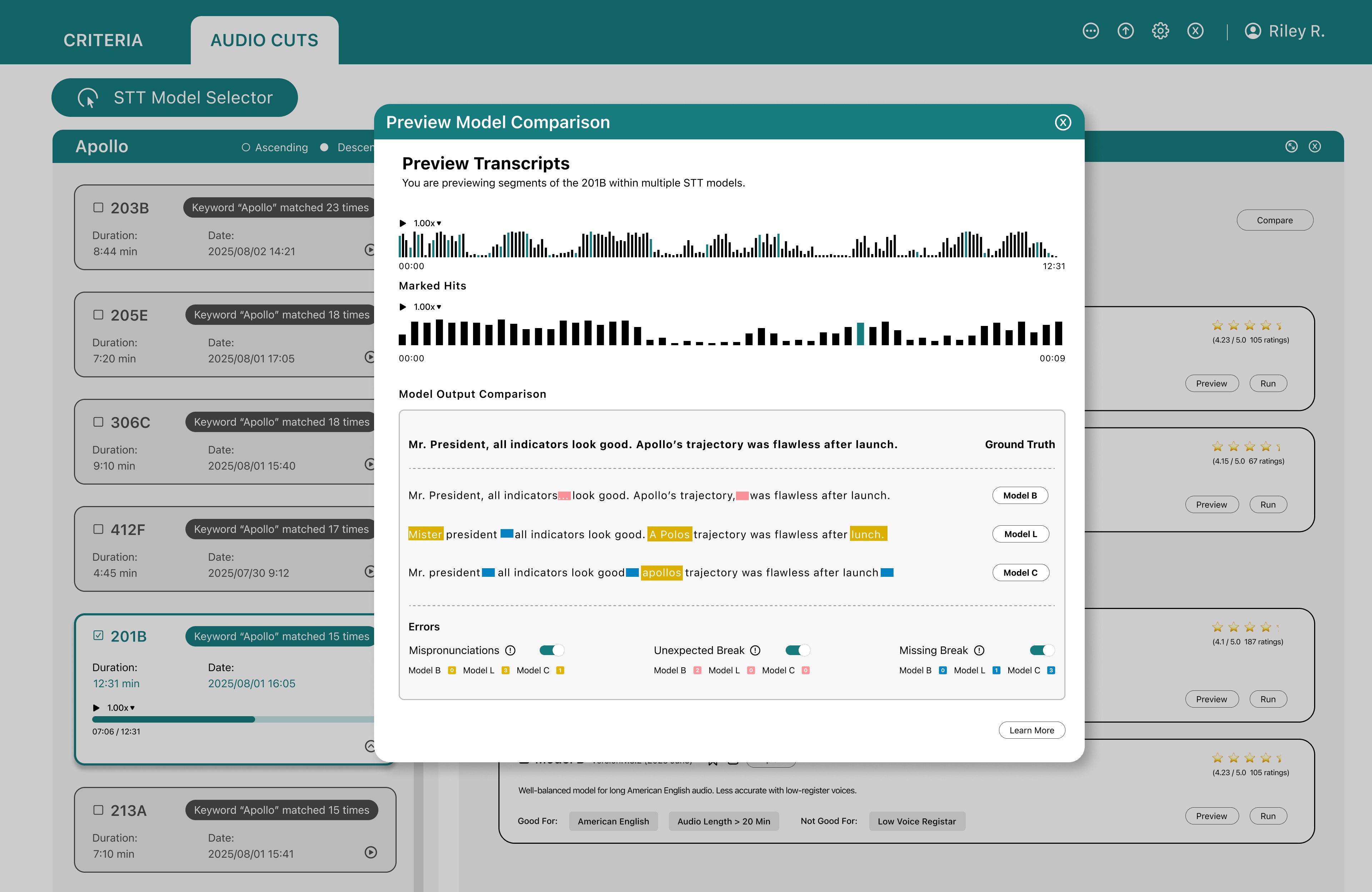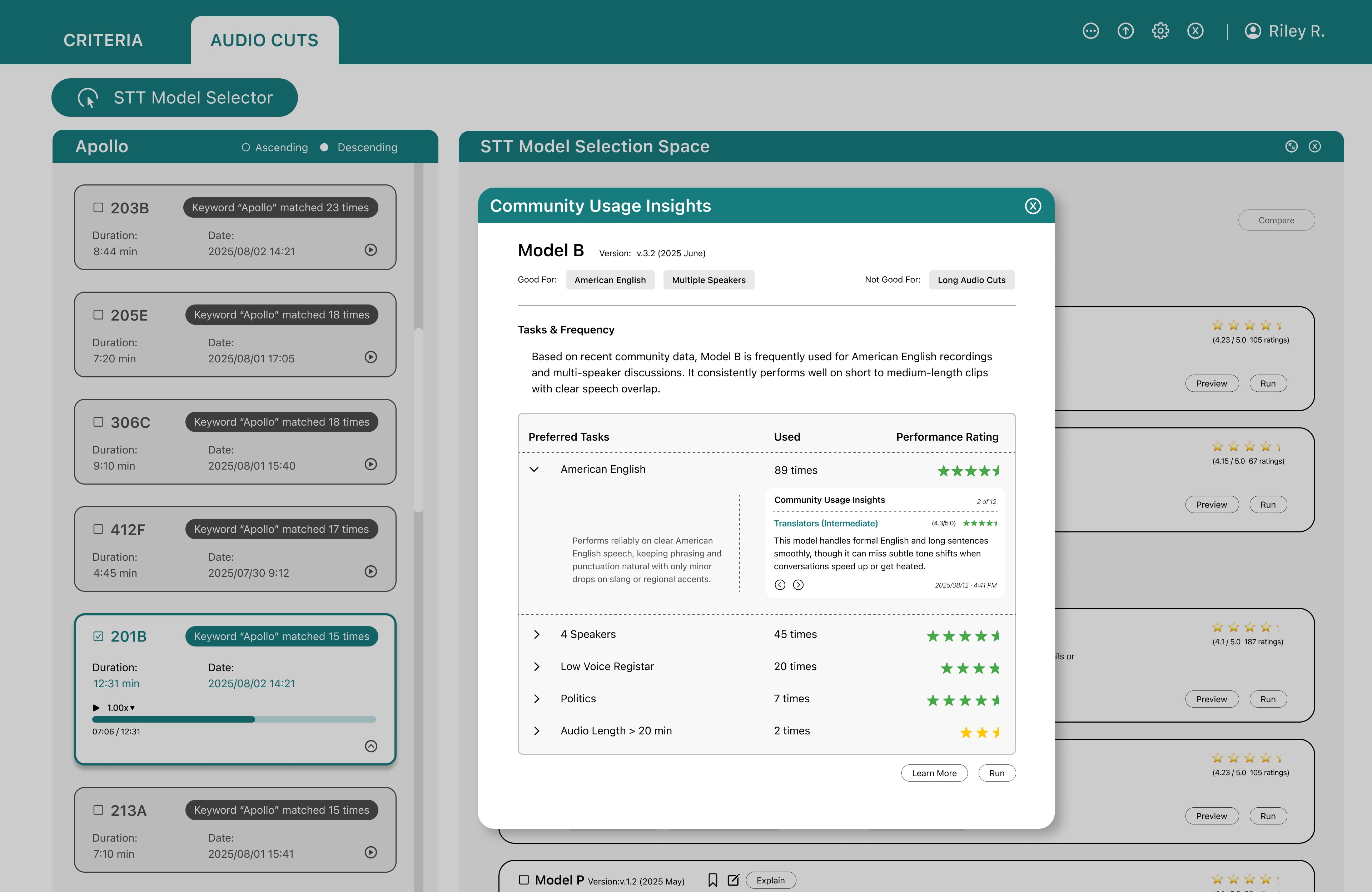 To bring the final system to life, we used a scenario-based approach that follows Riley, a fictional language analyst working at the Nixon Historical Audio Task Force. Riley is piloting a new suite of specialized speech-to-text models optimized for different audio conditions, and her task is to identify conversations related to the Apollo space missions. This context allows the system to be shown in both fast-moving analysis and deeper validation moments within a realistic workflow.
