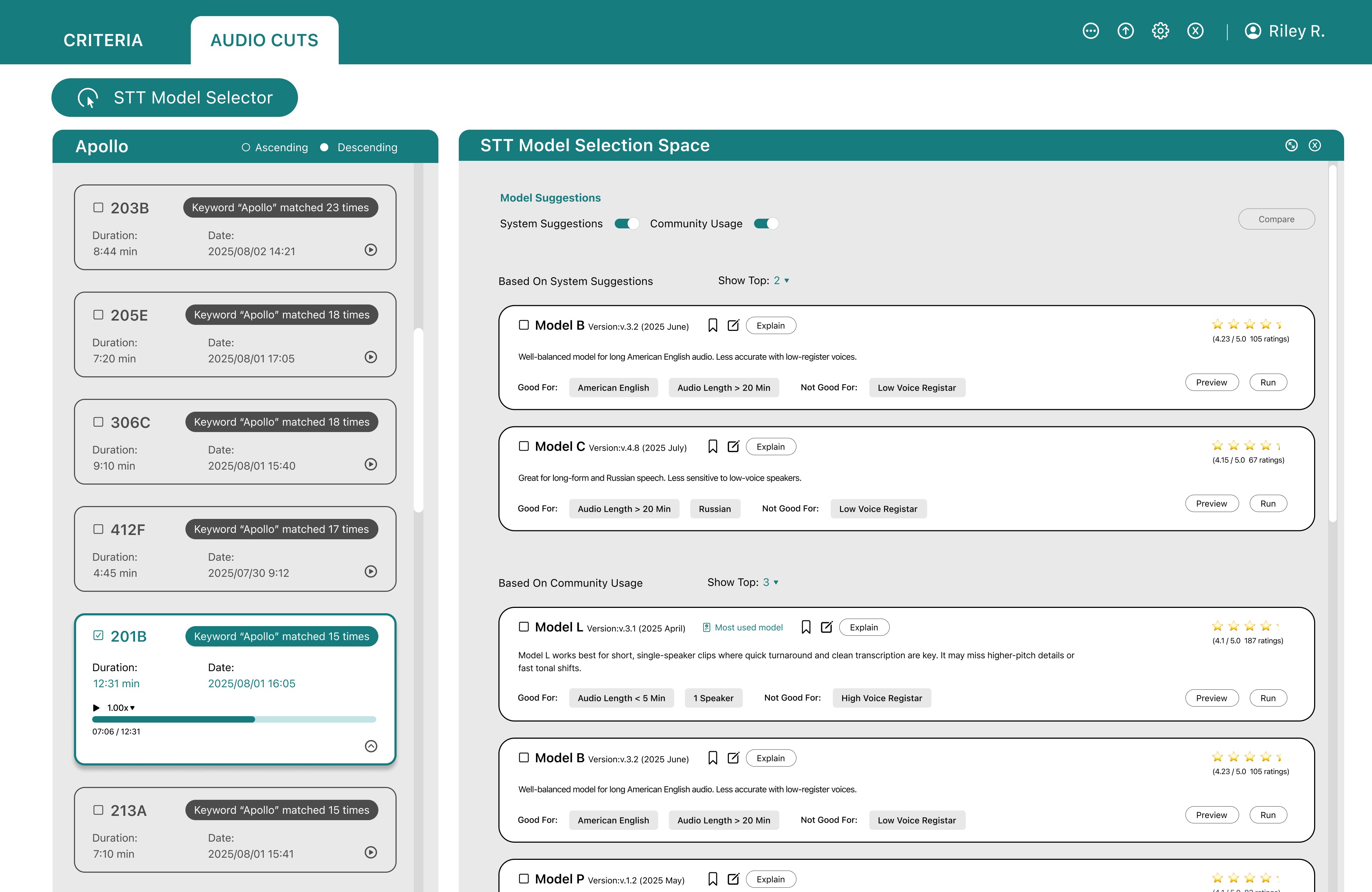 In this direction, the system detects key audio characteristics based on the selected audio cut and automatically generates a ranked list of STT model recommendations. Analysts are presented with glanceable Level 1 explanations that combine system recommendations and community usage signals to support quick decision-making.